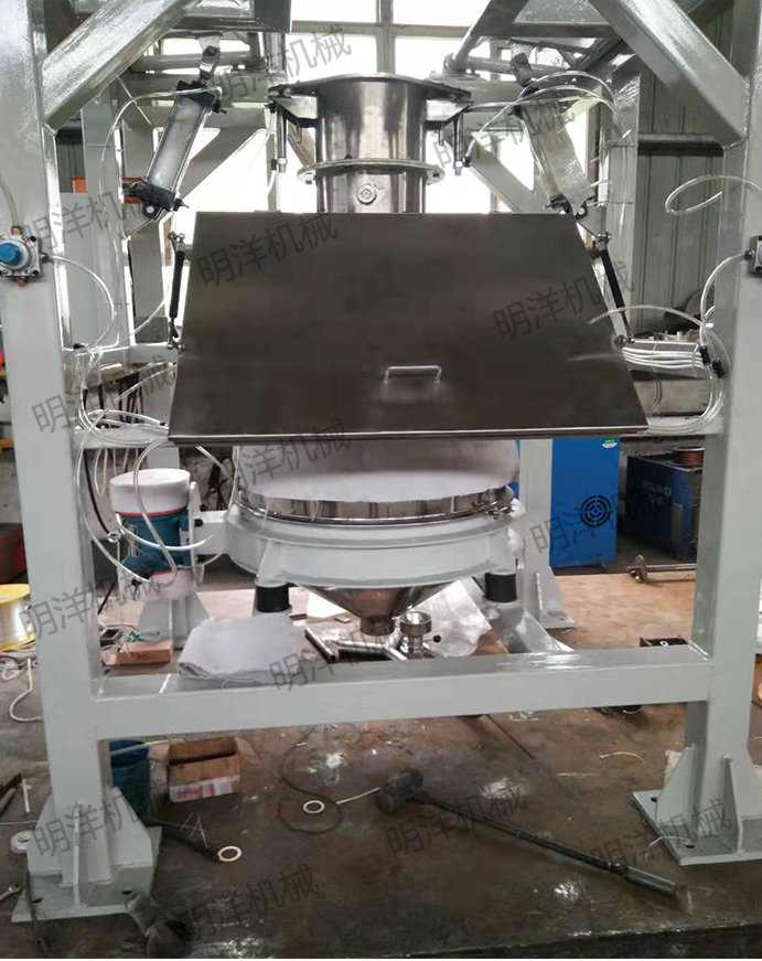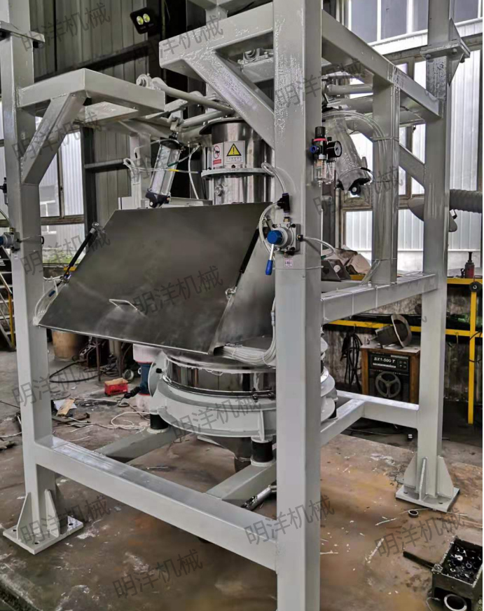 MYDWT-1噸包投料站是通過電動葫蘆或叉車提升料袋至投料口,人工通過手套箱將包裝袋下料口拆開后,包裝袋內(nèi)的物料通過自重落到下方料斗中。